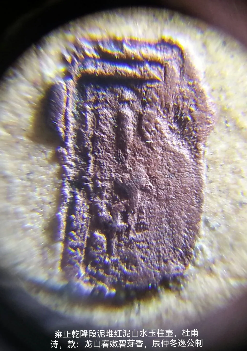 乾隆“辰仲冬逸公制”印款, 刻"龙山春嫩碧芽香“ 玉柱执壶段泥堆红泥“山水, 杜甫诗”江动月移石,溪虚云傍花。鸟栖知故道,帆过宿谁家”,宽18 腹10.7高14公分450克