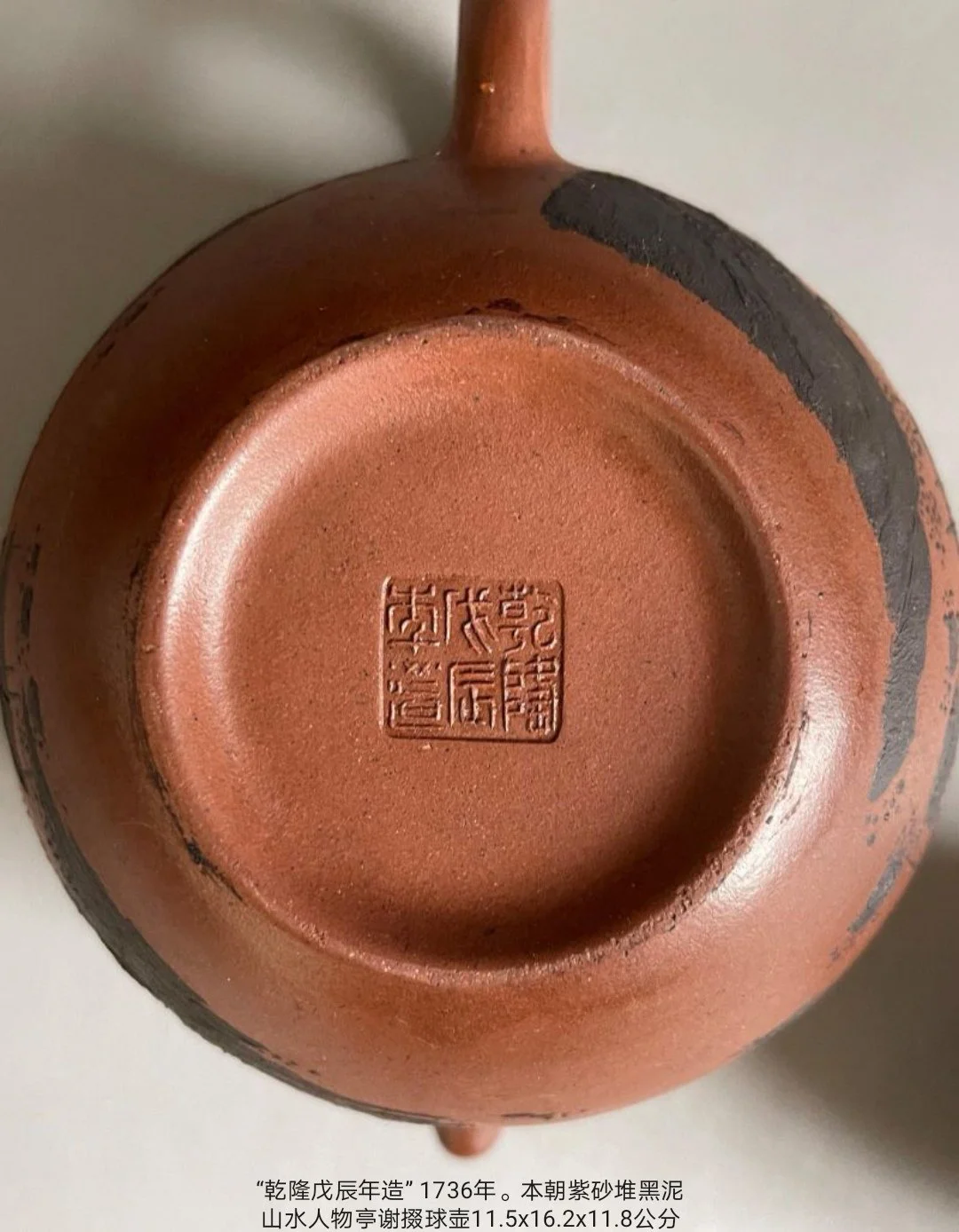 “乾隆 戊辰年造” (1736 年) 印 乌泥两面堆黑泥山水掇球壶。 宽16.2腹11.5高11.8公分325克