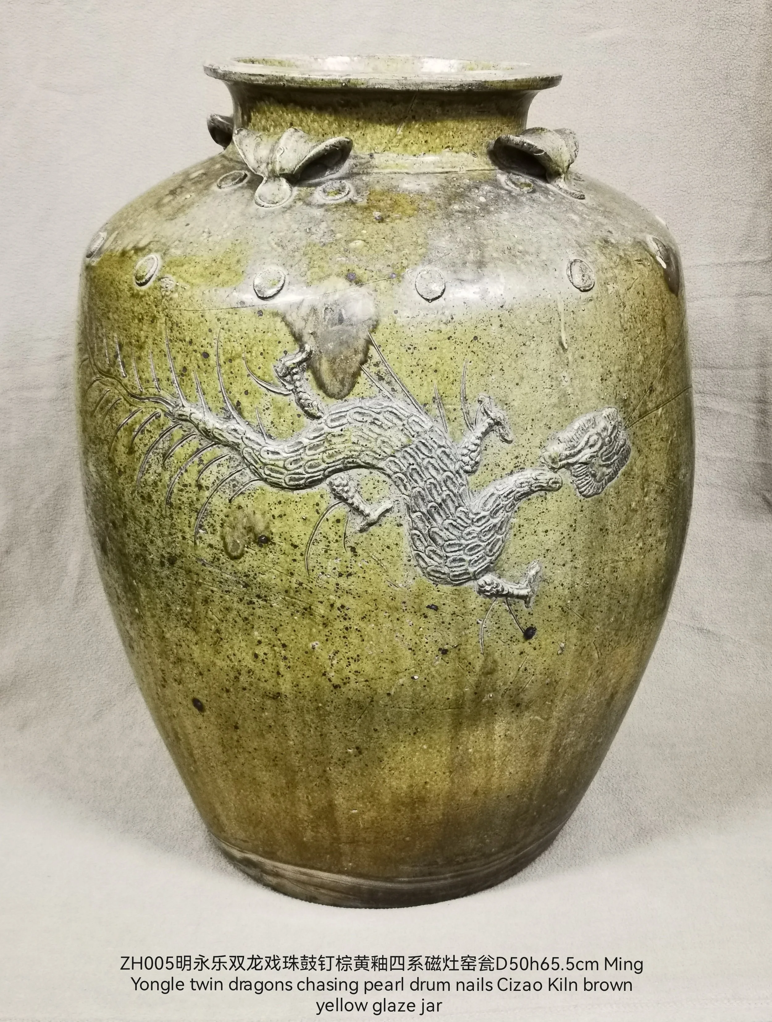 陈达生马六甲藏二龙磁灶窑土黄釉永乐瓮(前后)65.5cm, 来自砂劳越长屋土族长之传家宝